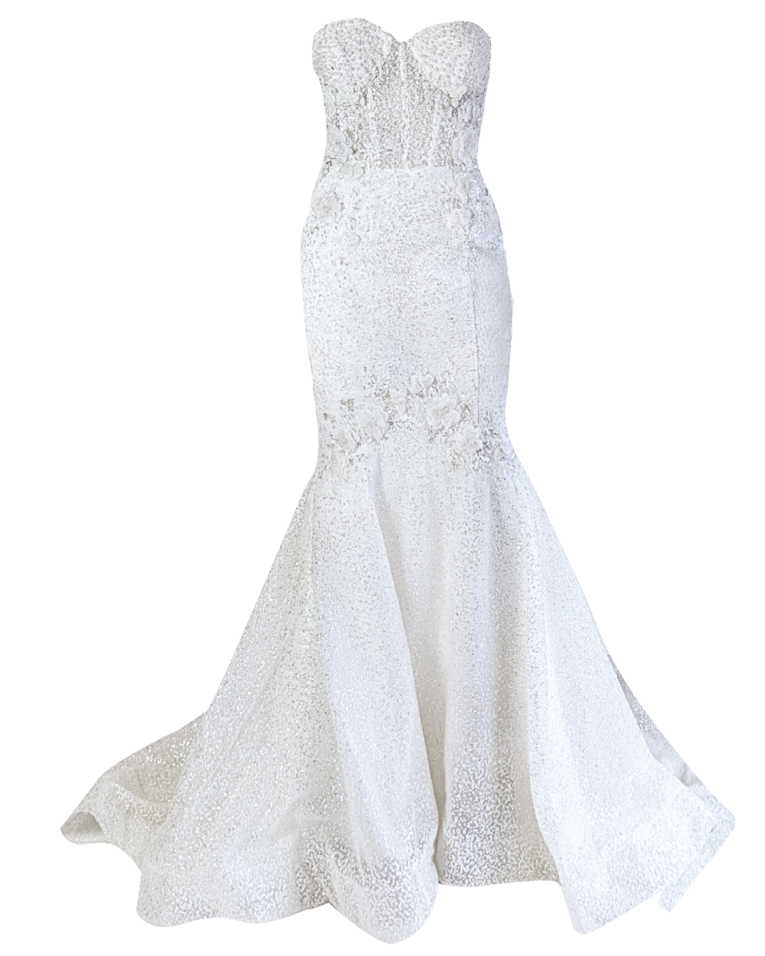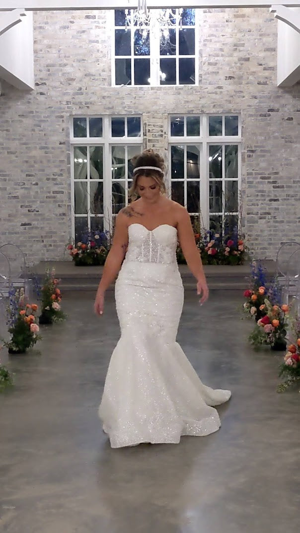 On-trend pearl bodice corseted sweetheart glitter mermaid with luxurious bead flower accents. Chapel train, zip closure with satin buttons.