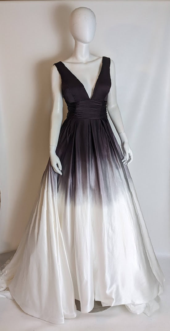 Sleek and classic, Essence is a luscious pure silk lightweight satin. Pleated waist, chapel train, zip back with buttons.